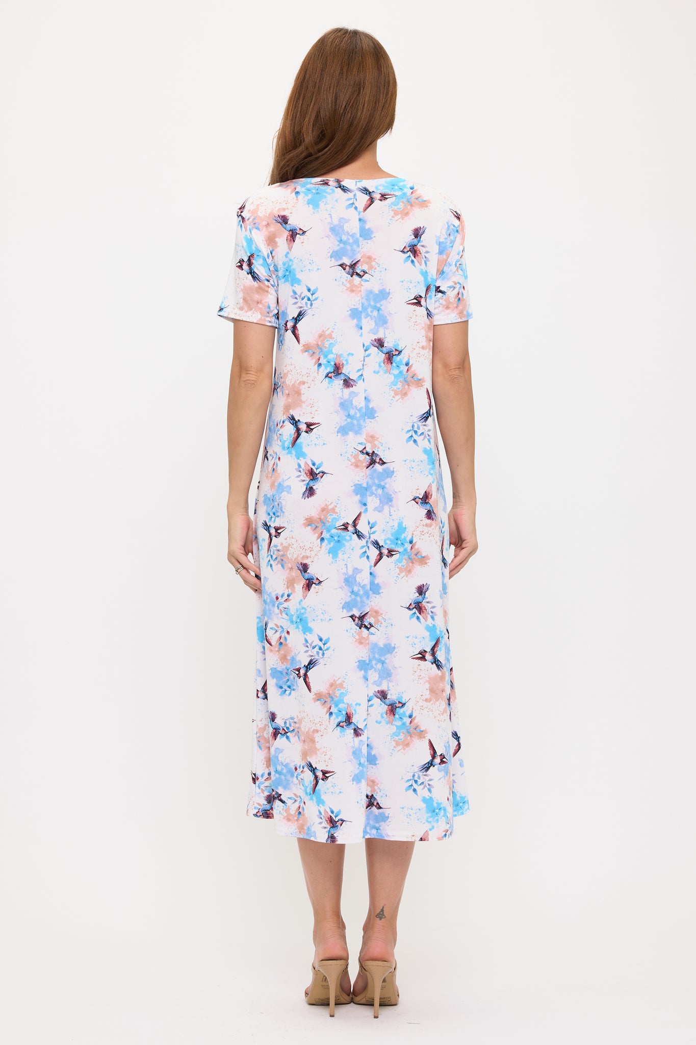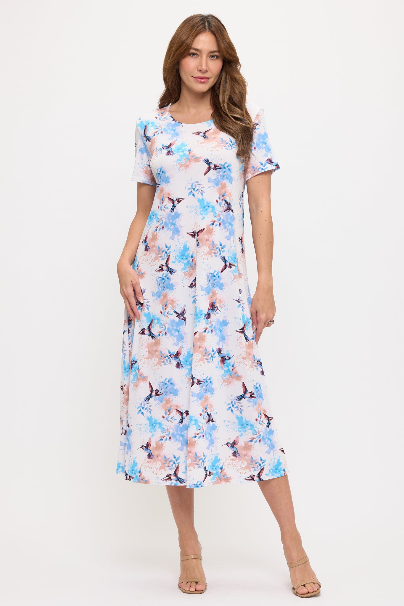 Short sleeve and soft round-neckline long dress with a variety of prints available and 49 inches in length.