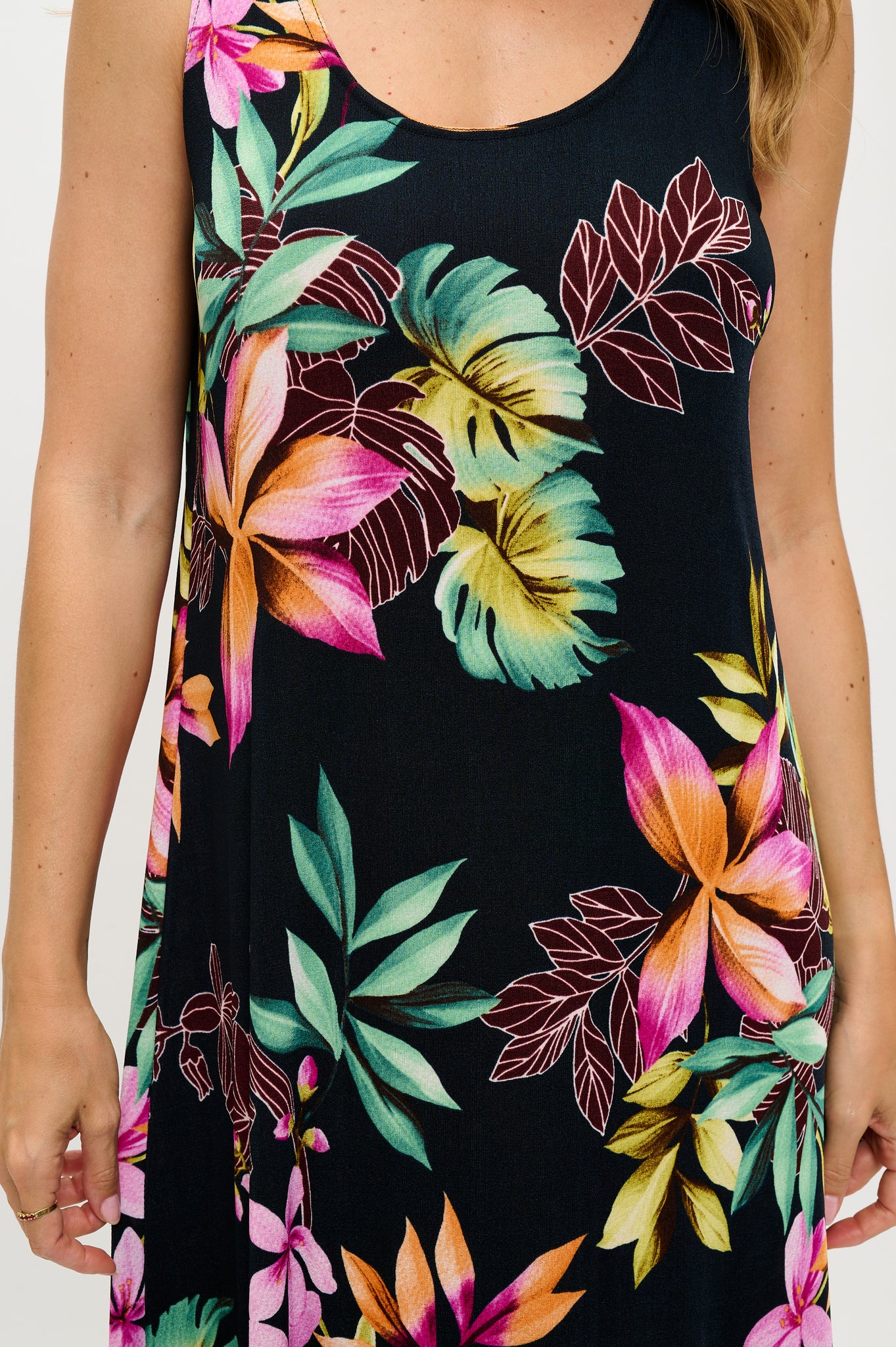 Discover the BNS Tank Long Dress, where style meets comfort effortlessly. Adorned with eye-catching prints, this dress adds a trendy flair to your wardrobe. Its tank-style silhouette and round neckline offer a comfortable and flattering fit, perfect for any occasion. Crafted with wrinkle-resistant properties, it's a go-to choice for travelers, ensuring you stay polished on the move. Made in the U.S.A. from 90% Polyester and 10% Spandex, this sleeveless dress is available in various prints, measures 50 inches in length, and is easy to care for with cold water washing.