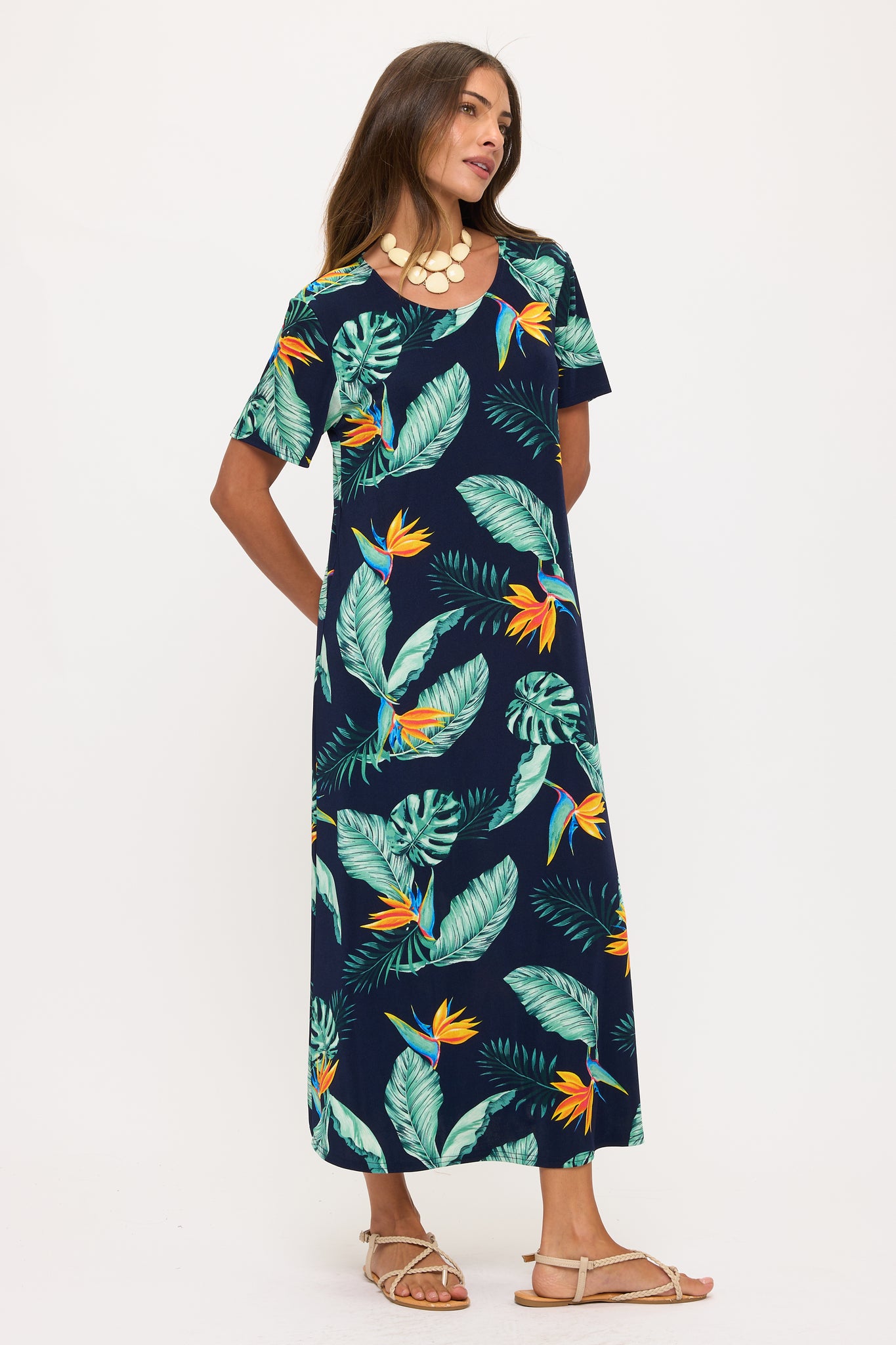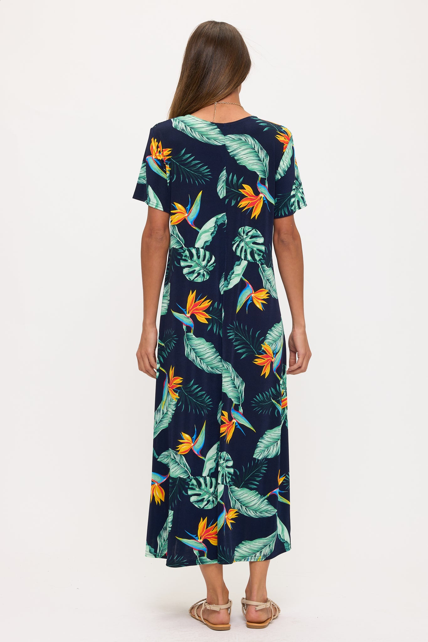 • Short sleeve and soft round-neckline long dress with a variety of prints available and 49 inches in length.