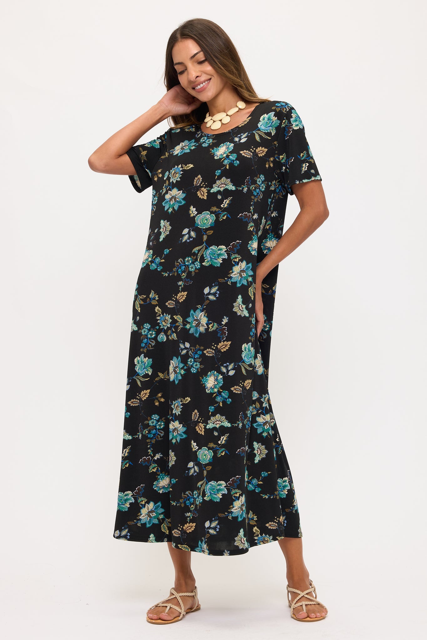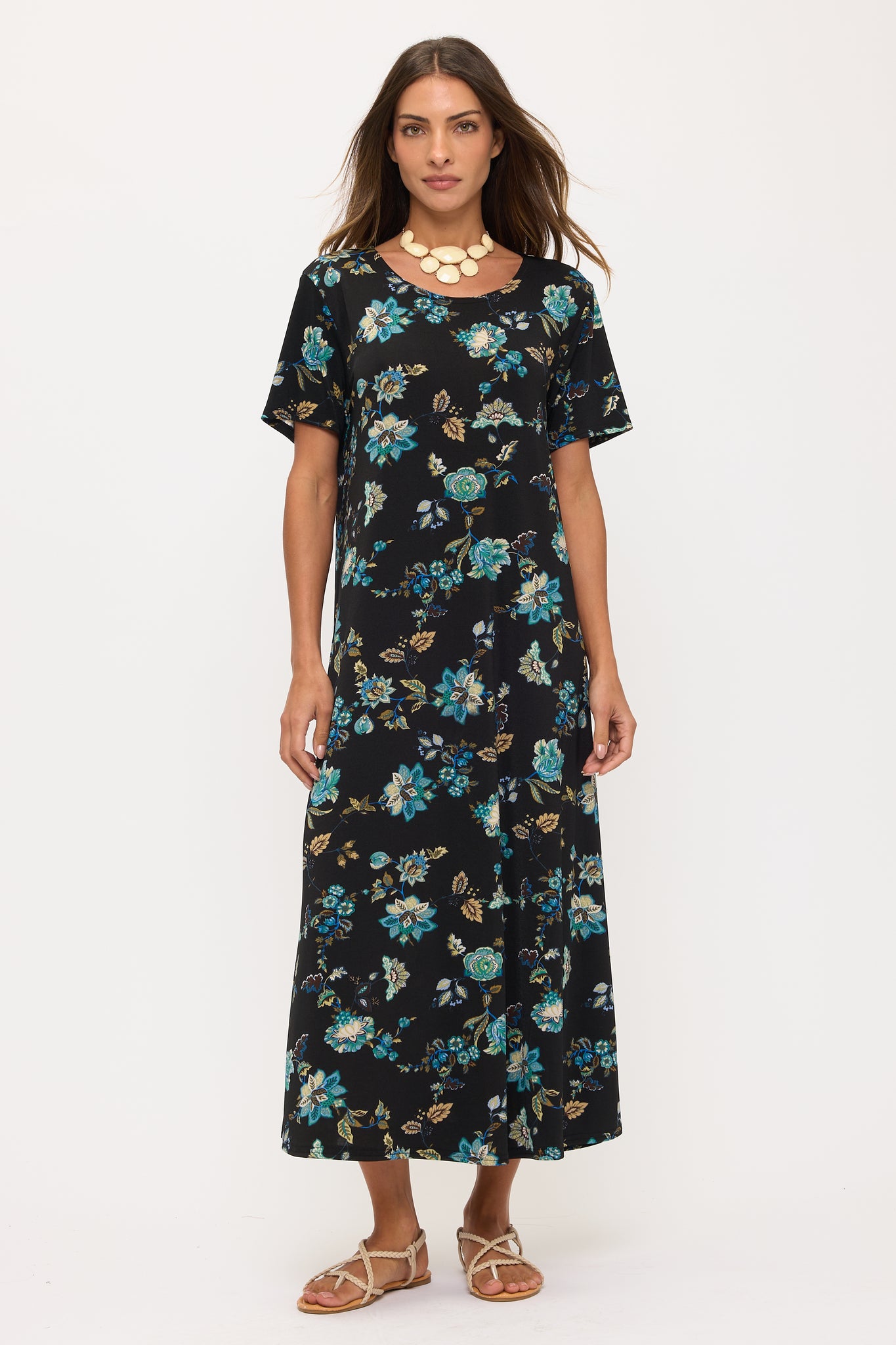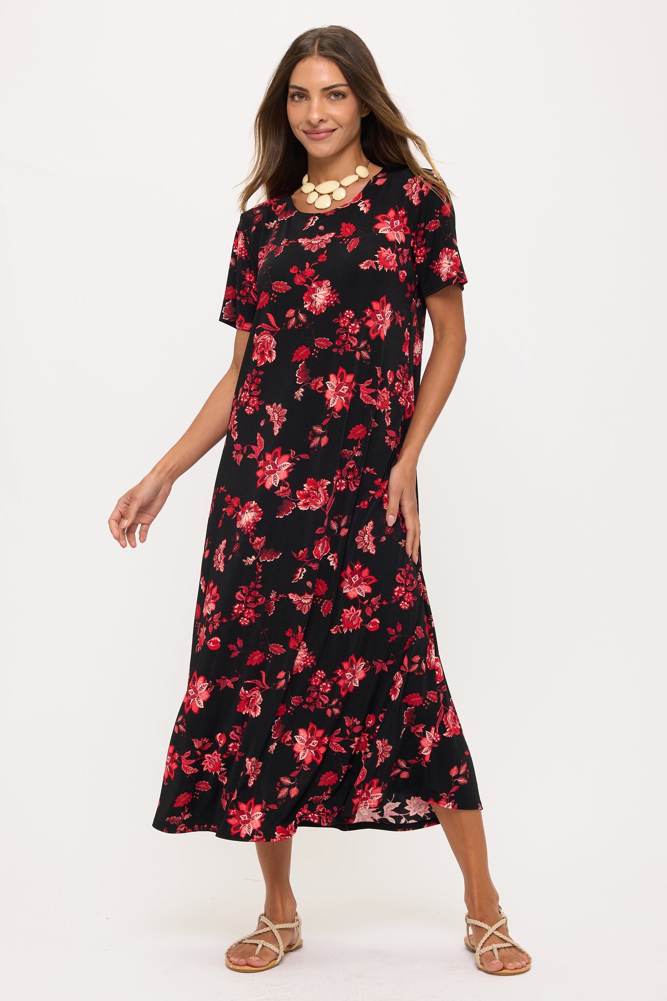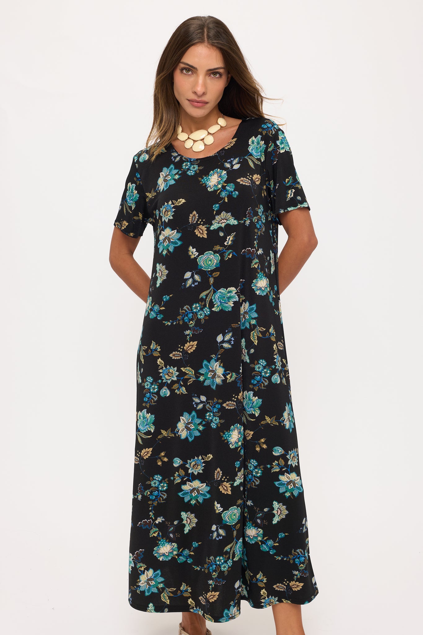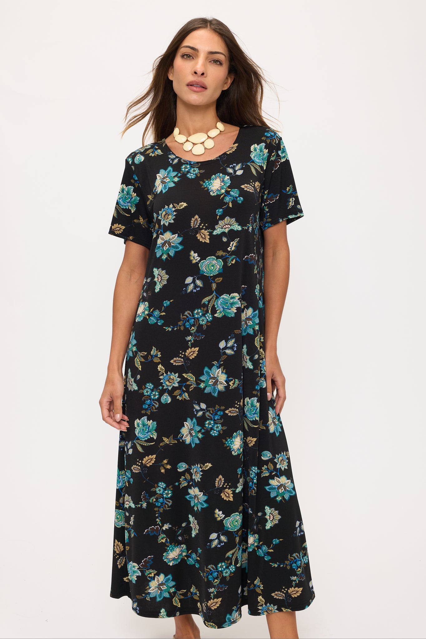 Short sleeve and soft round-neckline long dress with a variety of prints available and 49 inches in length.