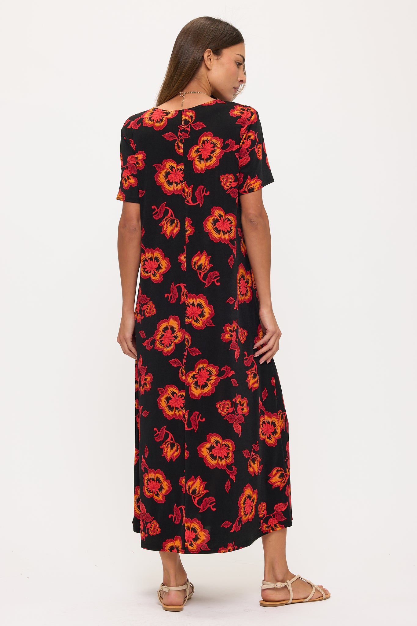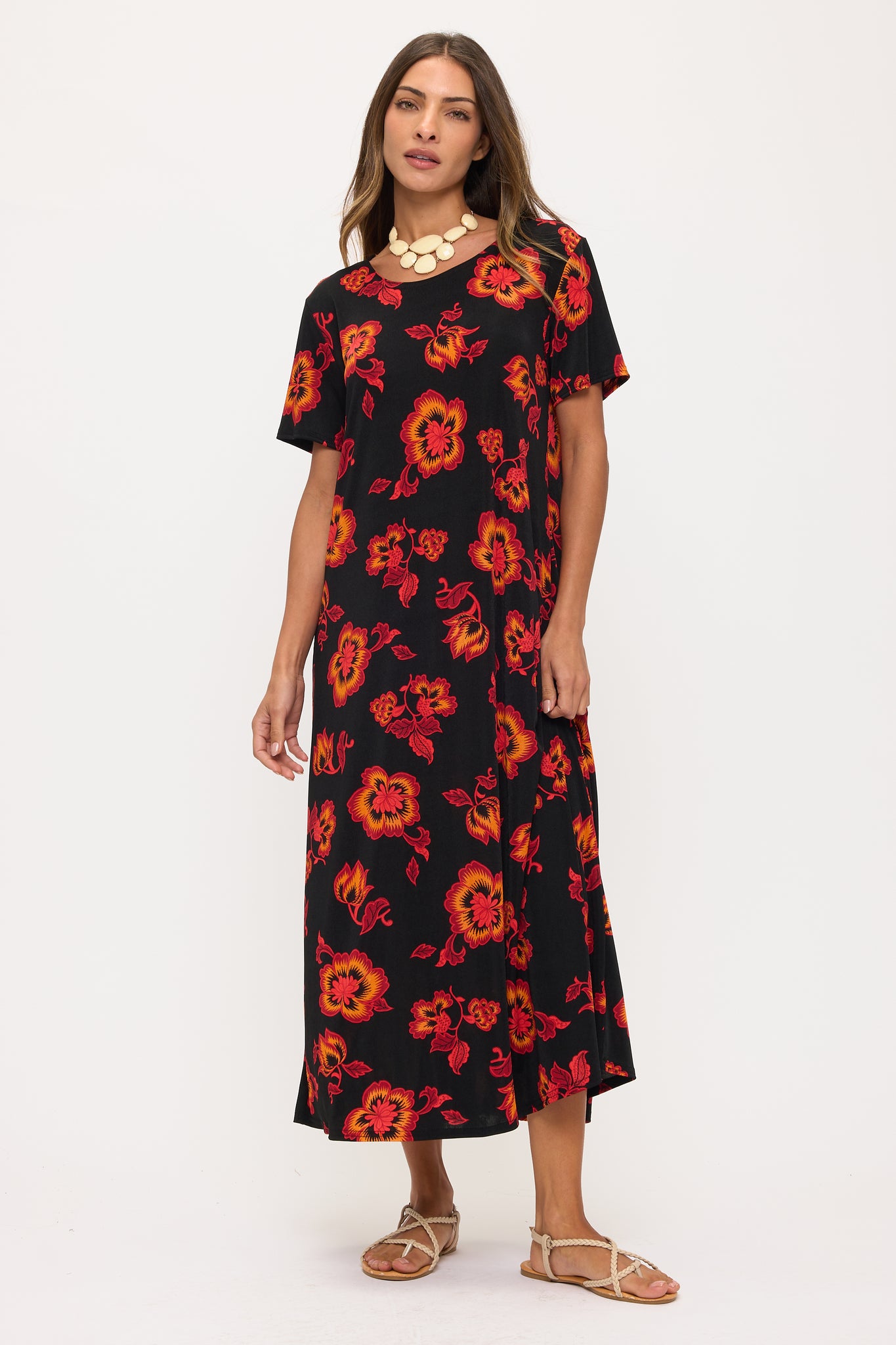 Short sleeve and soft round-neckline long dress with a variety of prints available and 49 inches in length.