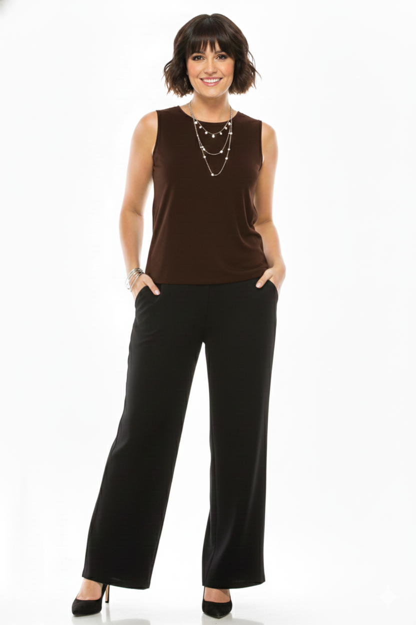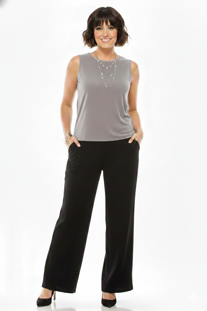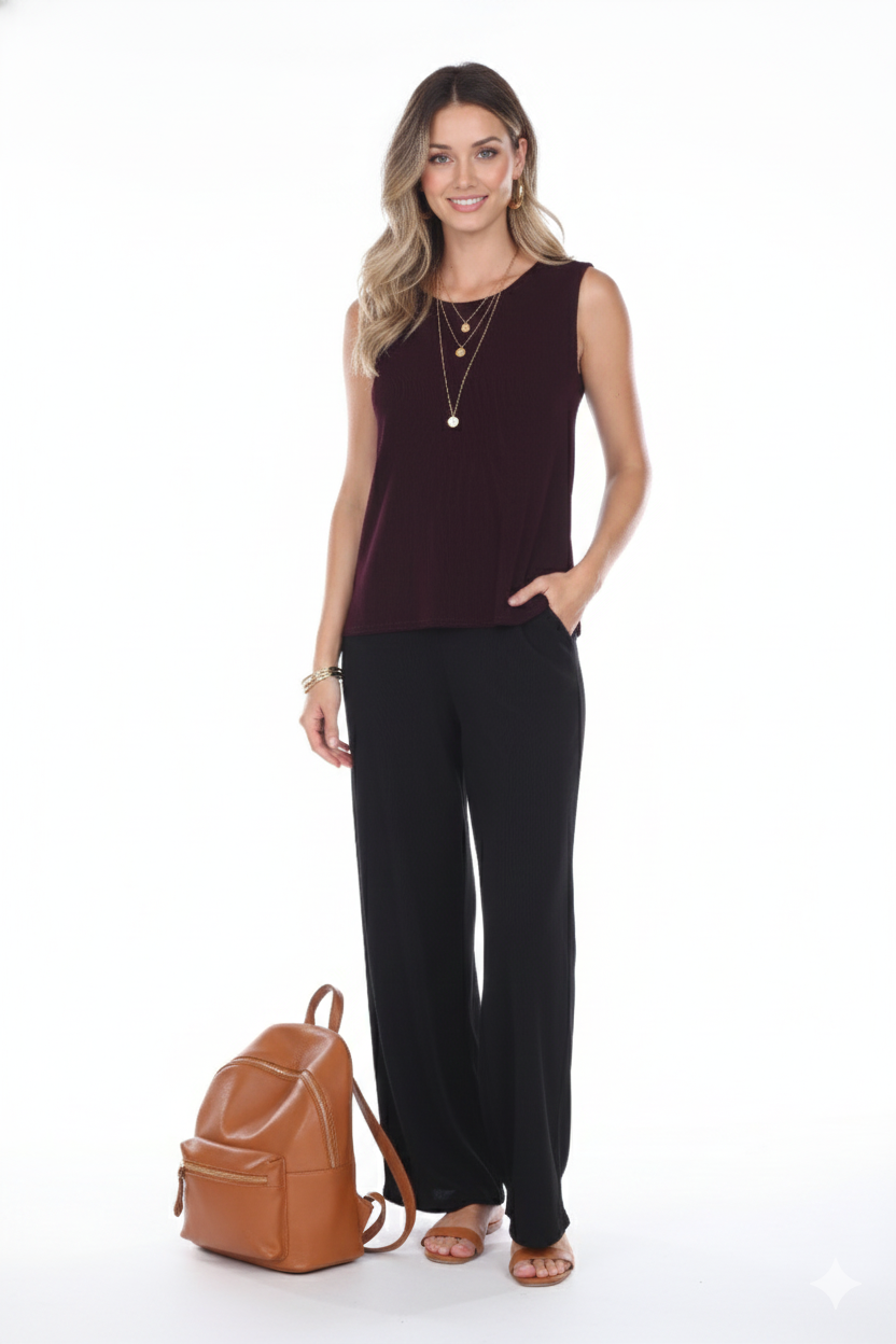 Sleeveless and soft round-neckline with side vents at bottom hem.