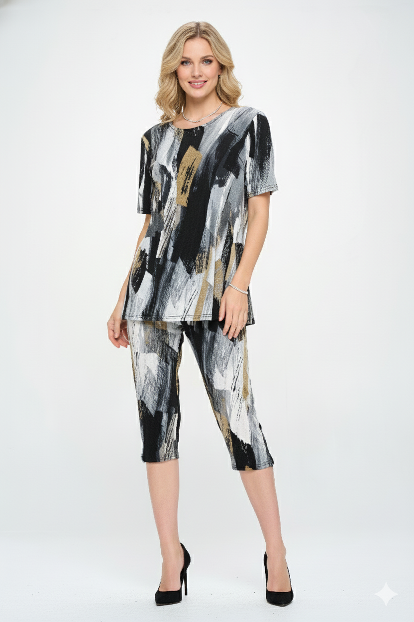 - Round neck short sleeve top and Capri pants set with a variety of prints available.
