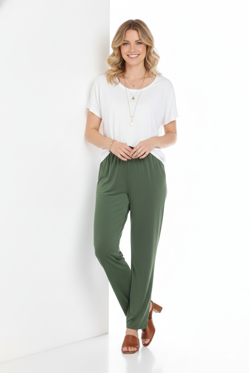 Comfortable and versatile, these pants offer a full length and easy pull on elastic waist.