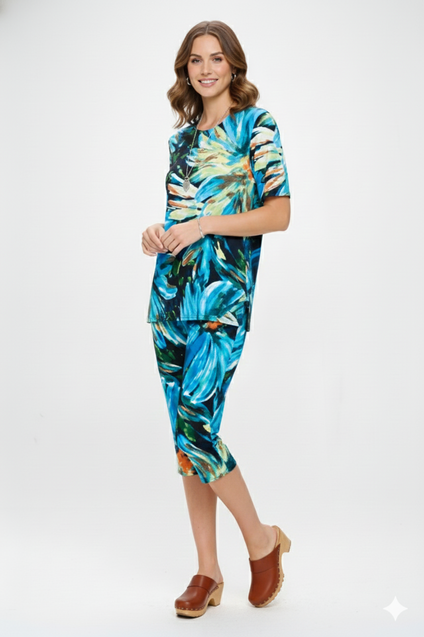 Round neck short sleeve top and Capri pants set with a variety of prints available.