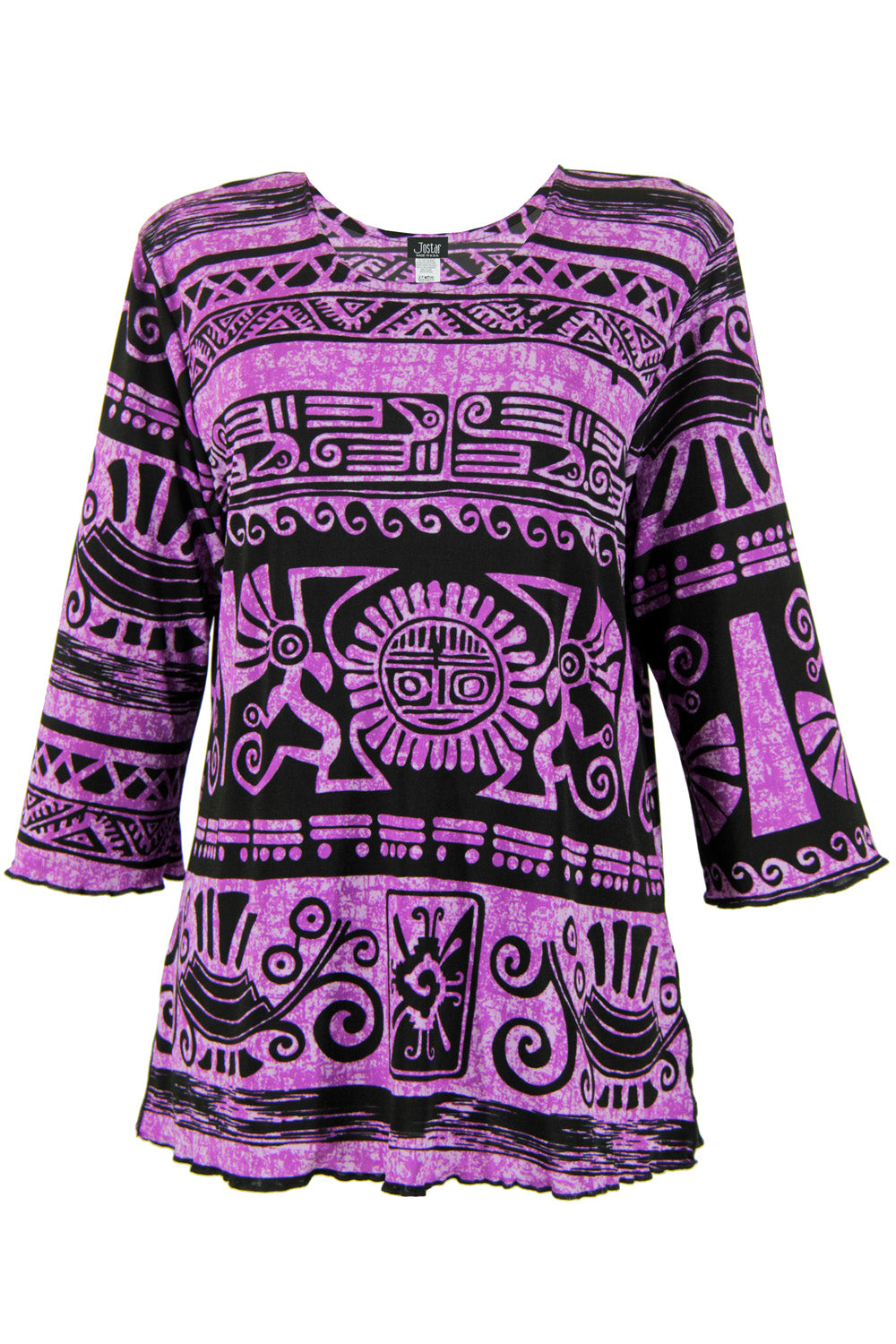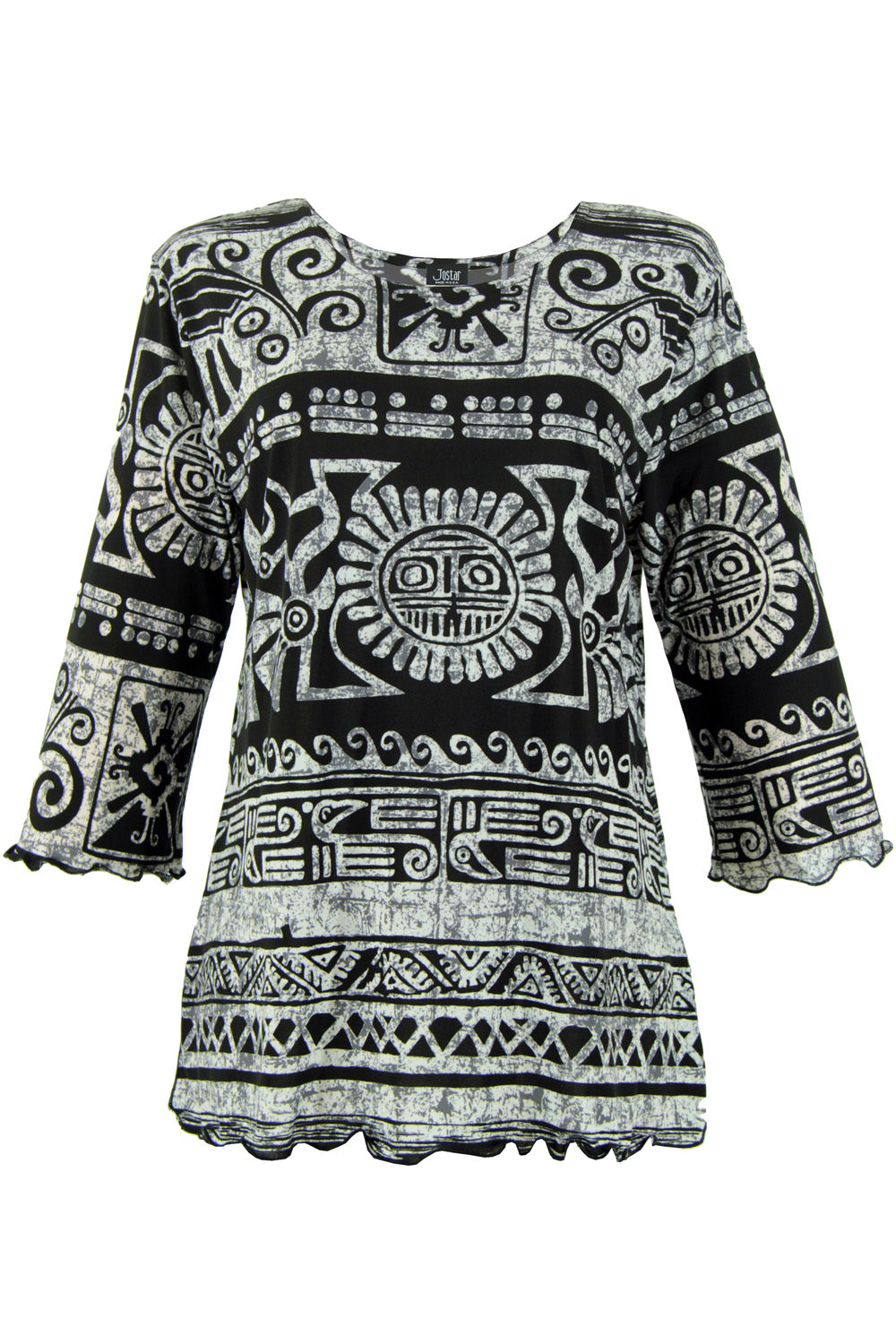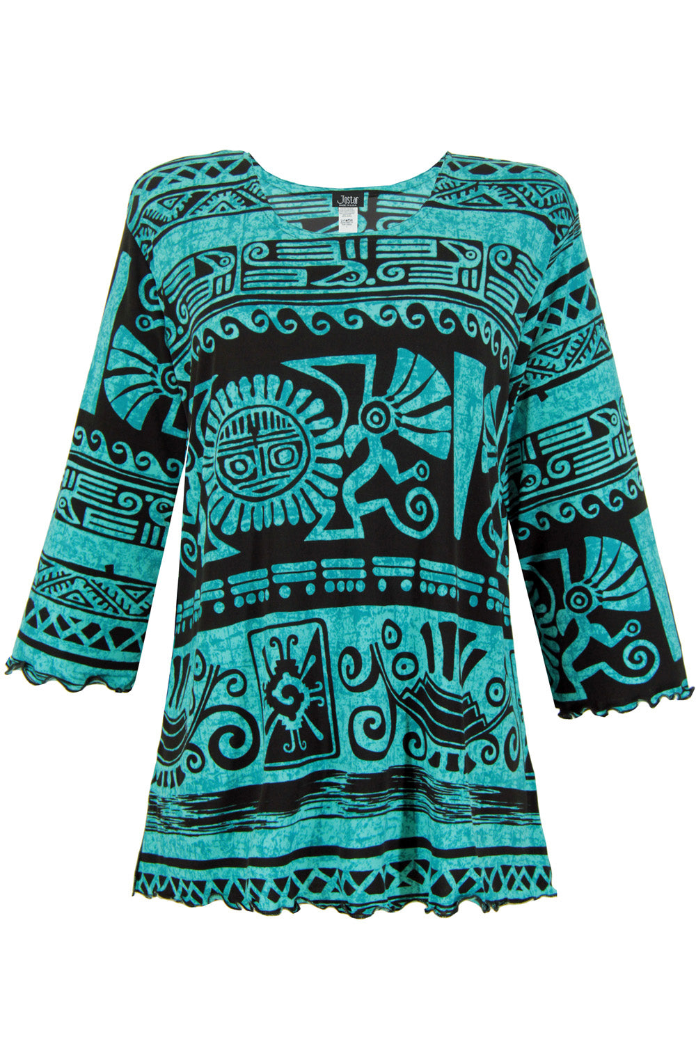 3/4 sleeves and soft round-neckline with Merrow bottom with a variety of prints available and an approximate length from shoulder to hem is 27 1/2 inches in size XL.