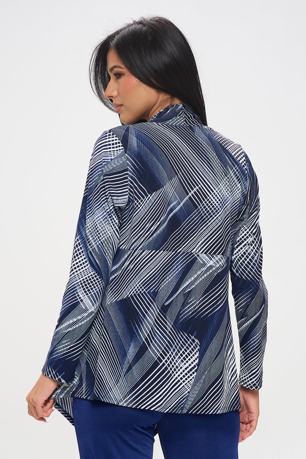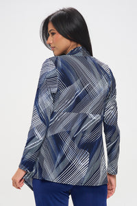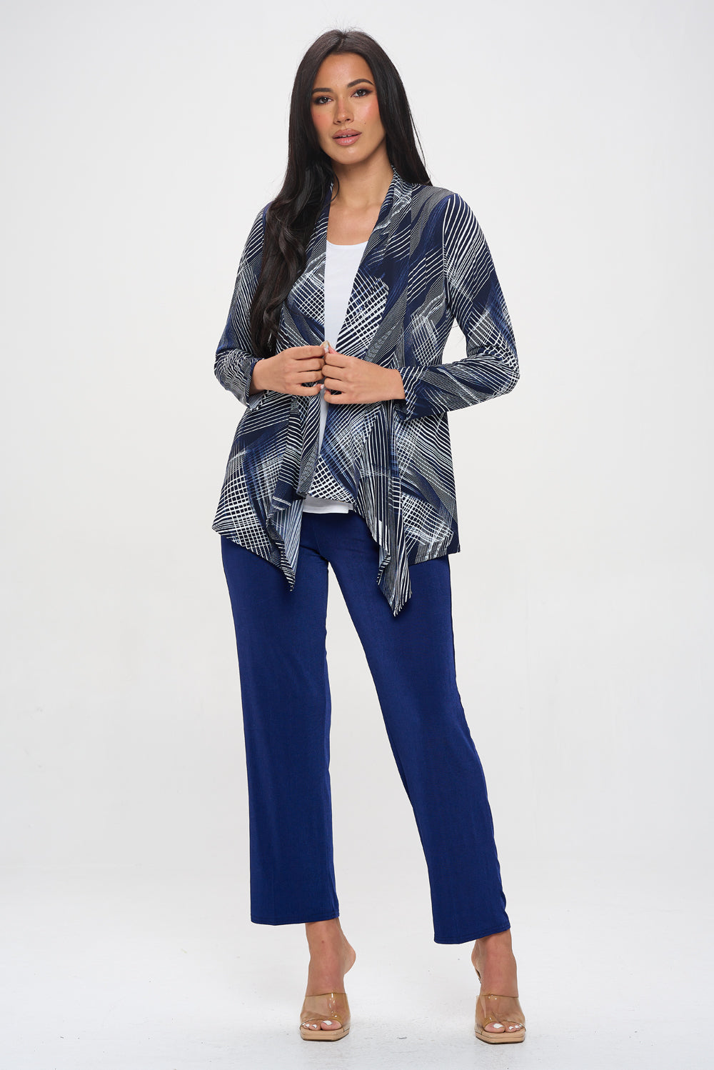 . This jacket is a true fashion statement, featuring a mesmerizing marble-like print that adds a contemporary and sophisticated touch to any outfit. Designed with a draped silhouette, it offers a flattering and comfortable fit for all body types. The long sleeves provide added warmth and versatility, making it suitable for both casual and formal occasions. The backside mid cut adds a unique and trendy element to the jacket's design, setting it apart from ordinary outerwear. Crafted from high-quality ITY fabric, made of 94% Polyester and 6% Spandex, it ensures superior comfort, flexibility, and durability. Complete the ensemble with the matching top (sold separately) as pictured, for a cohesive and fashionable look