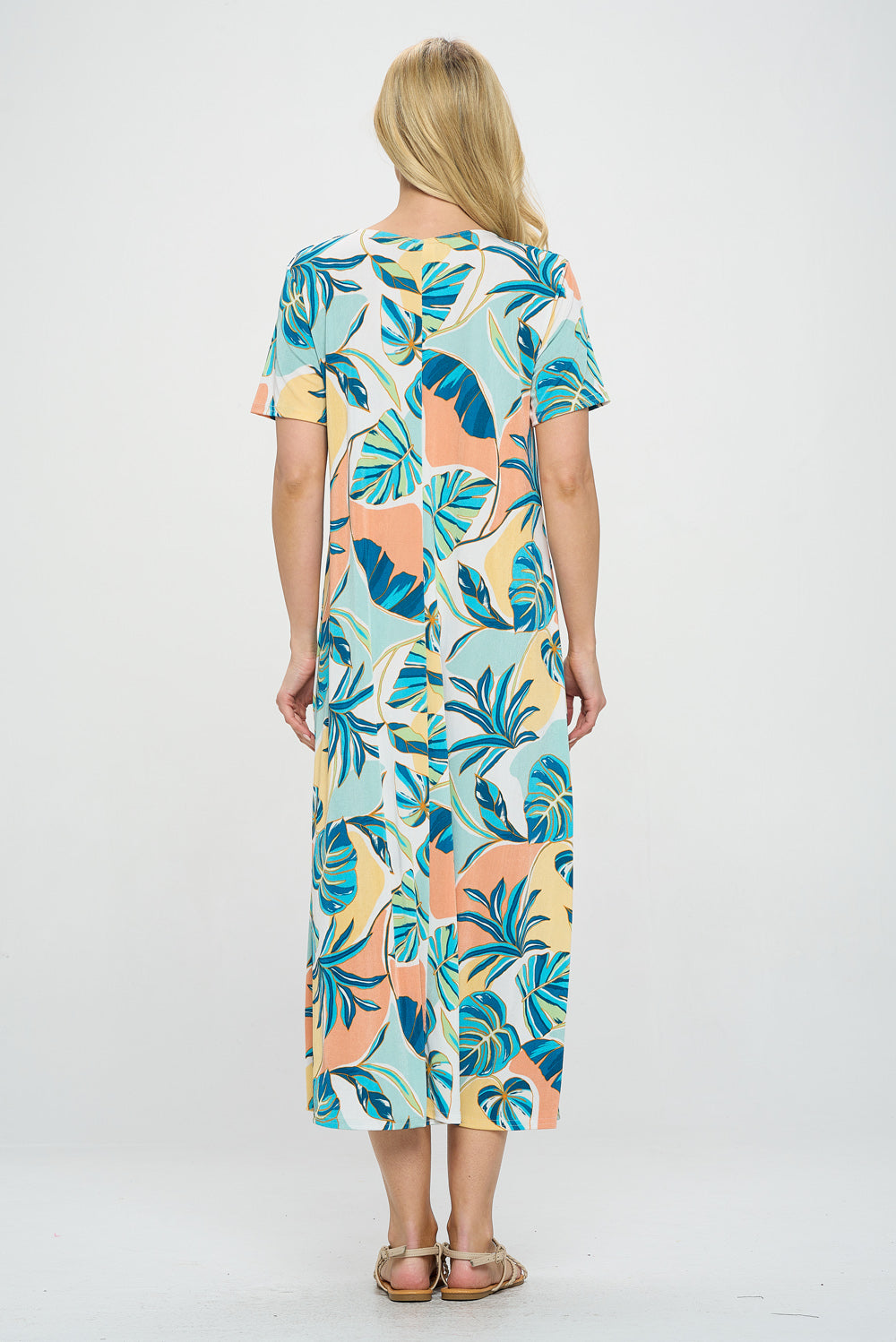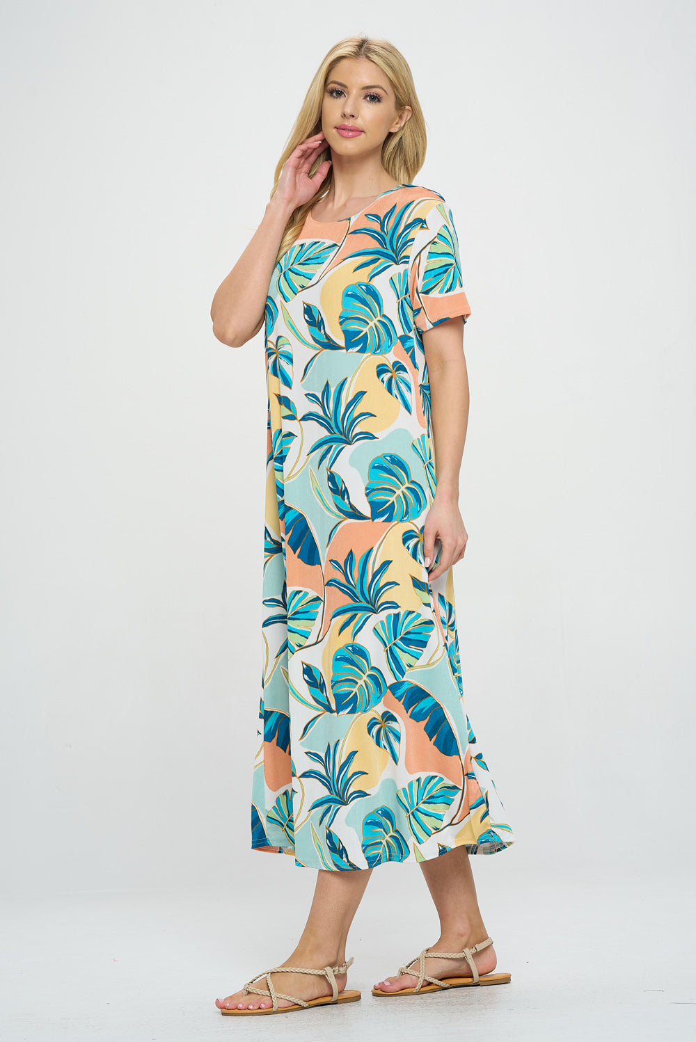 - Short sleeve and soft round-neckline long dress with a variety of prints available and 49 inches in length.
