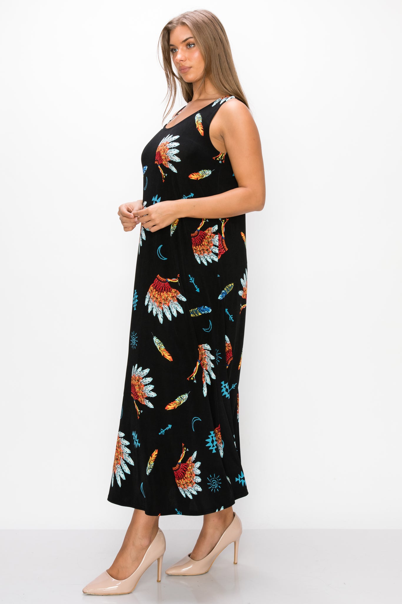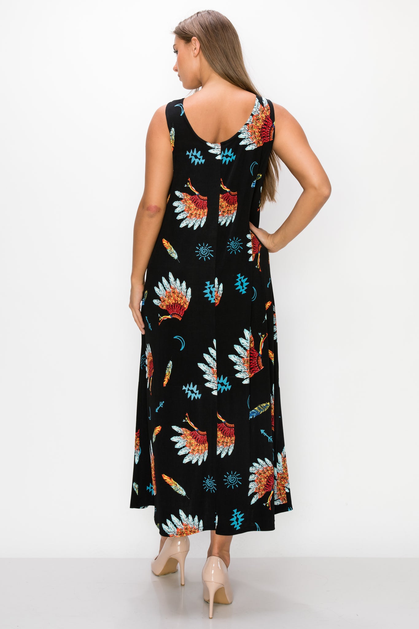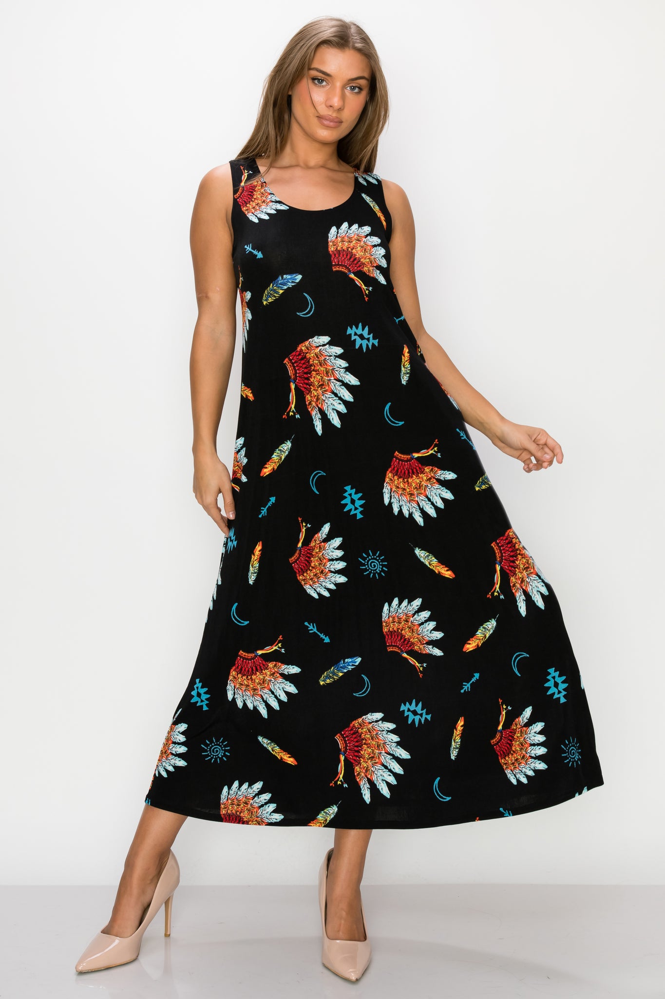 - Sleeveless and soft round-neckline long dress with a variety of prints available and 50 inches in length.