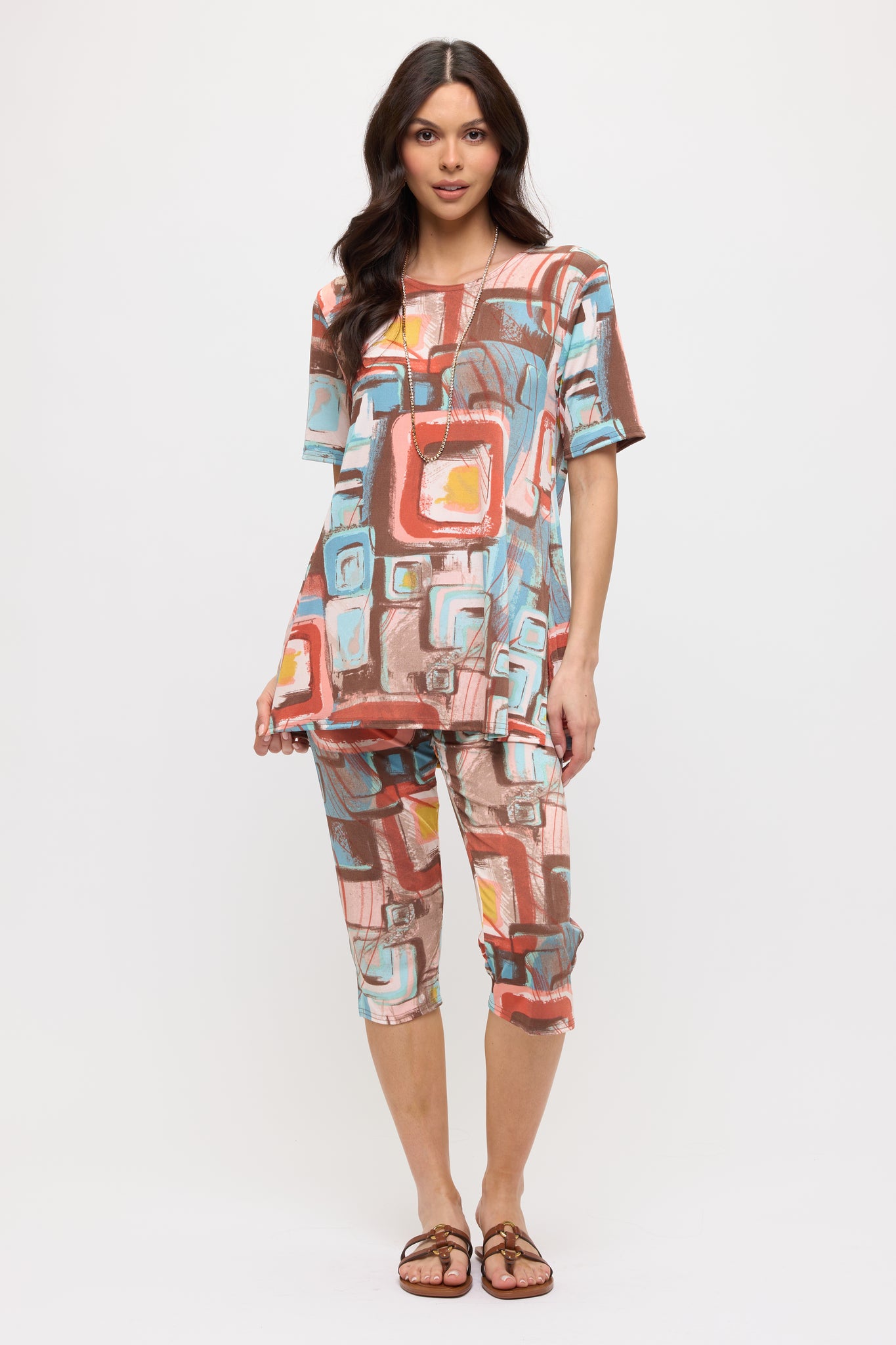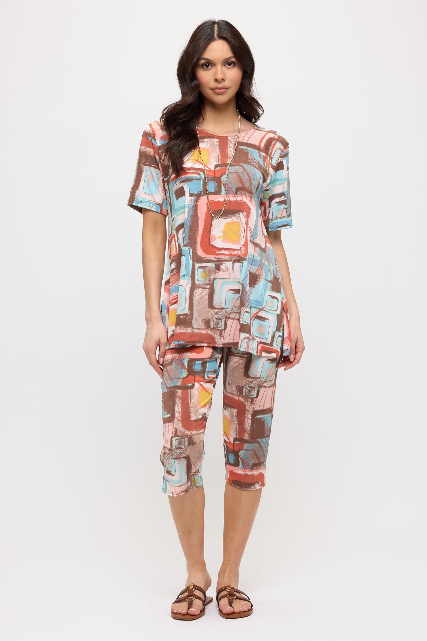 Perfect traveling set or for everyday use. Beautiful print for both top and pants. Elastic waist and pull on pants and round neckline matching top. Easy to wash and most of all wrinkle-free. Round neck short sleeve top and capri pant.